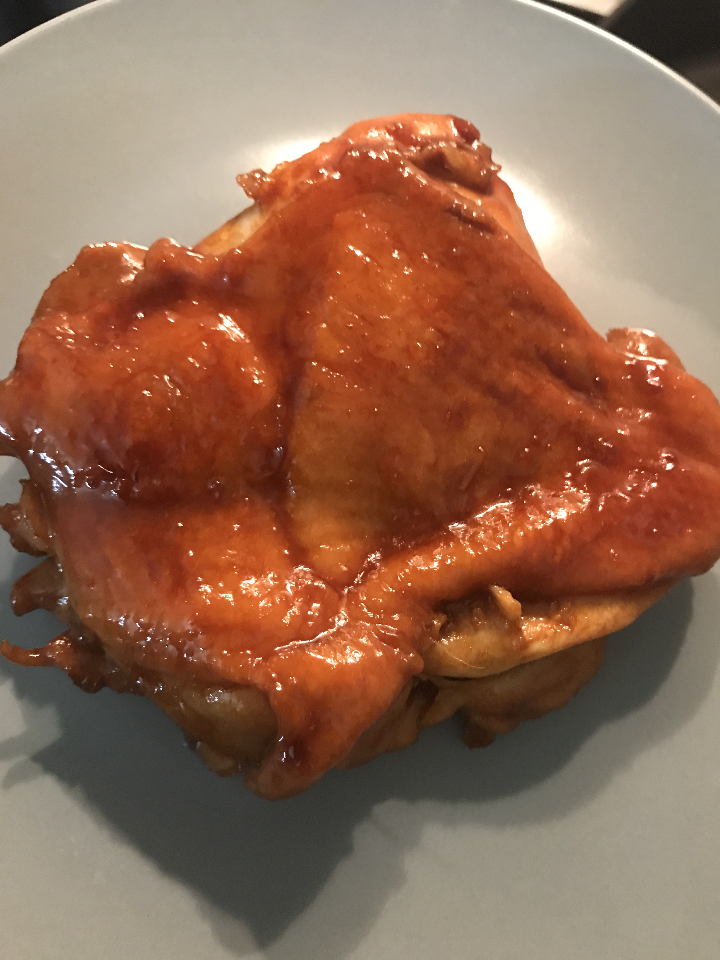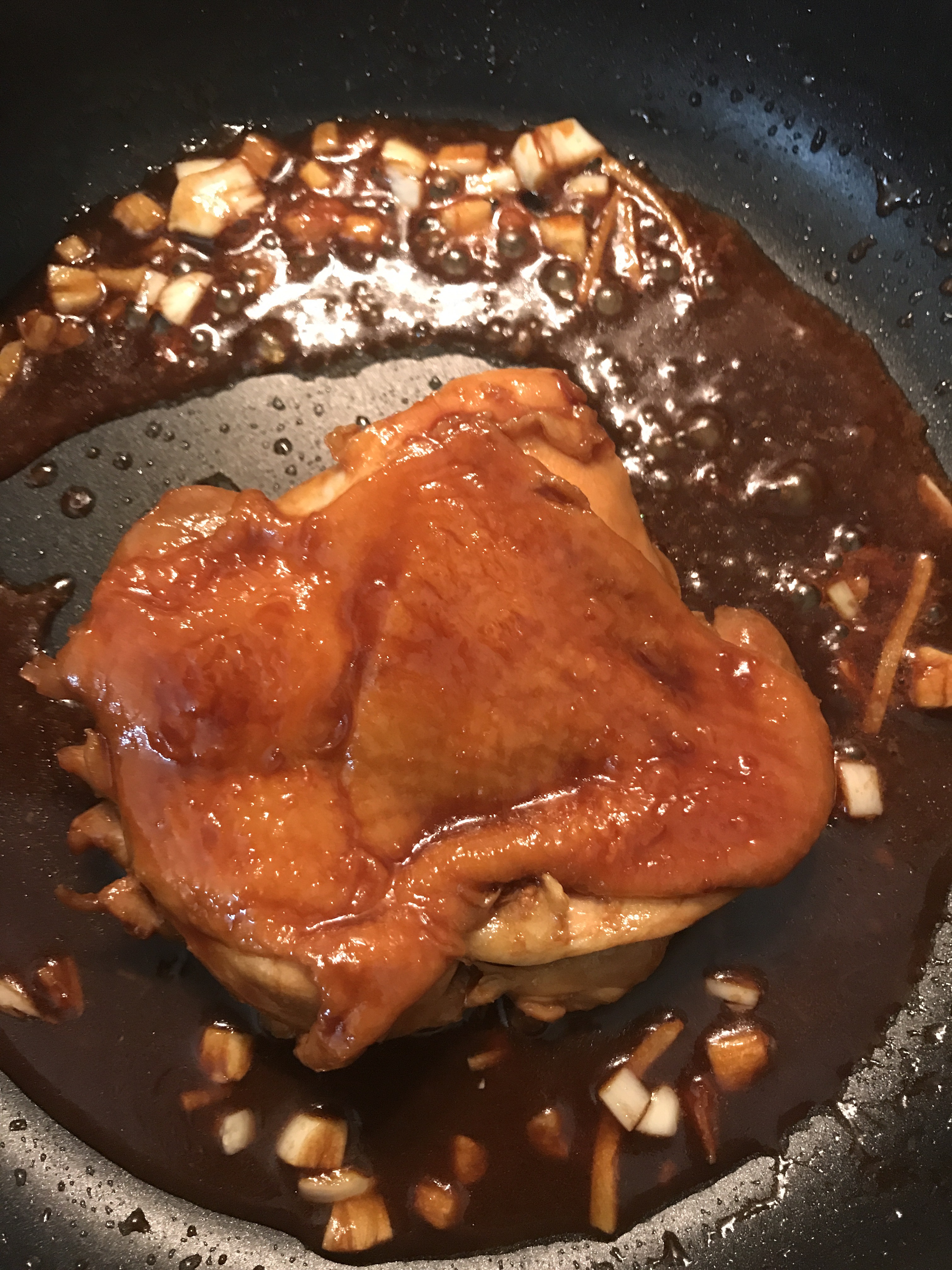 2. Put chicken into the pan. Flip it to let it be coasted with sauce.