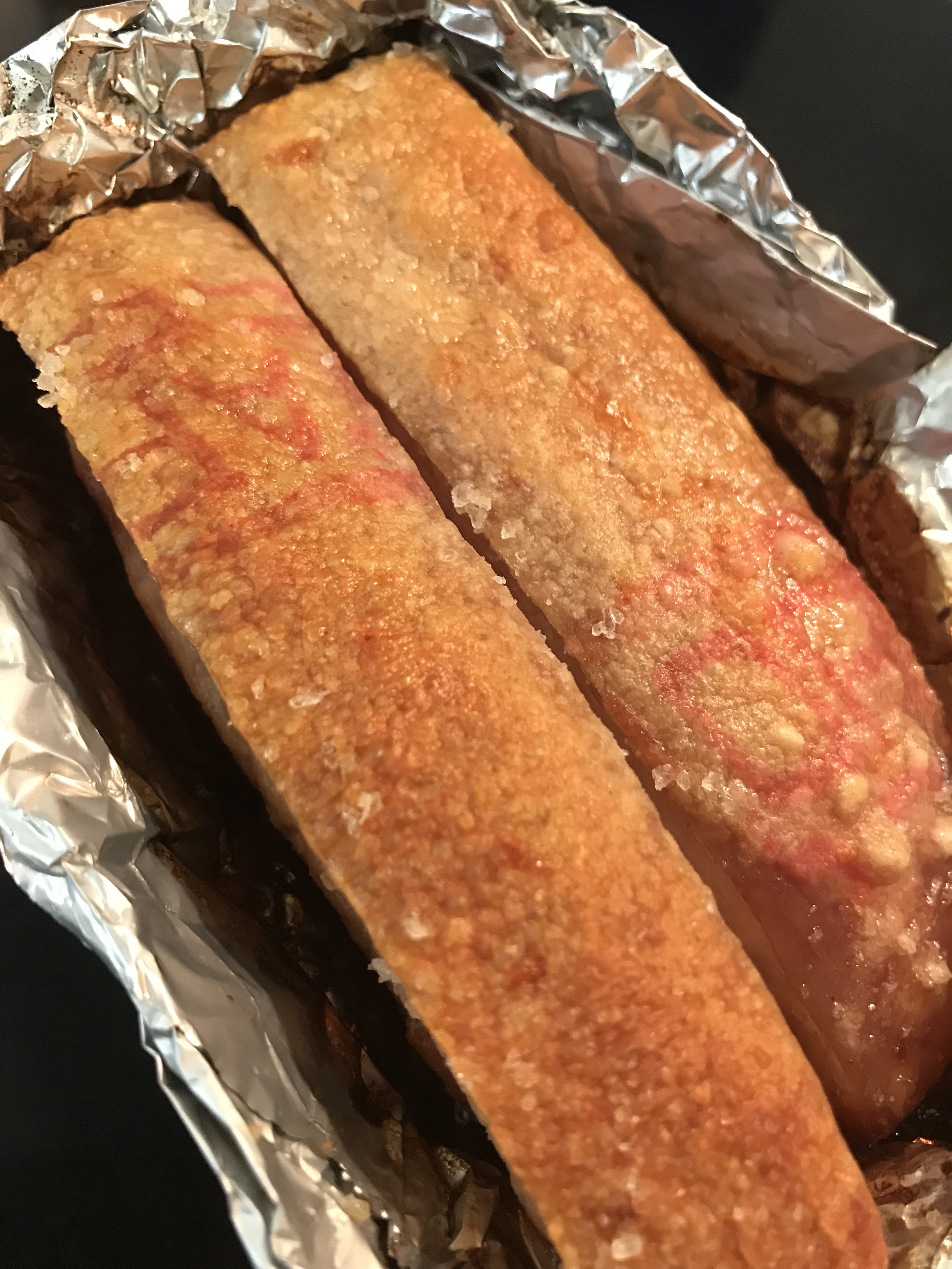 10. Remove the salt layer. Turn to the highest heat. Poke the skin again. Bake for another 20-30 mins. Till the skin turns golden and hard.