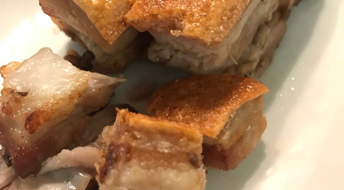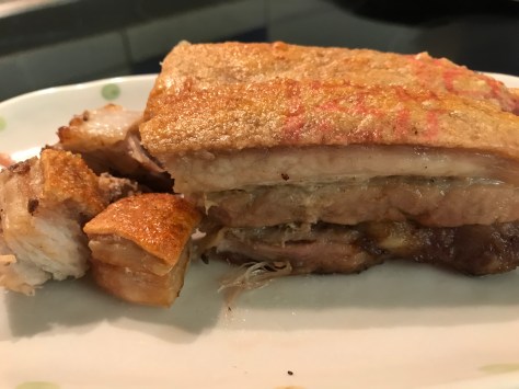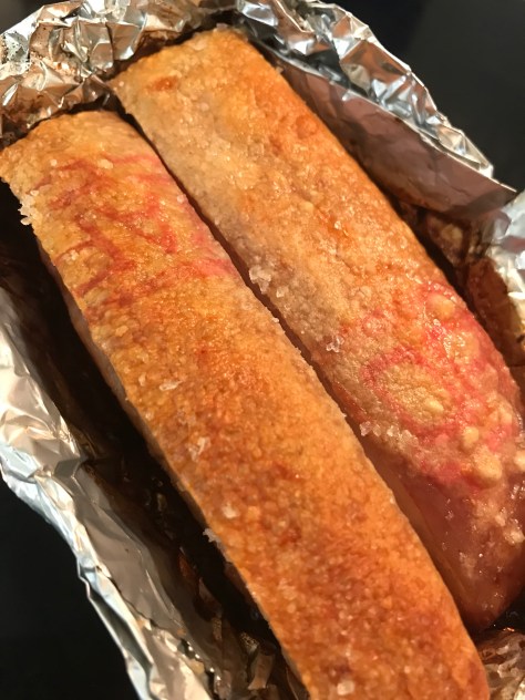 6. Use foil to make a square box and put pour the marinade into it. Place the pork belly in it with the skin side on the top.