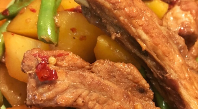 2. Heat a little oil in the pan. Add in chopped garlic, ginger & dried red chili. Sauté till aromatic. Add drained ribs in. Fry ribs till a bit golden brown.