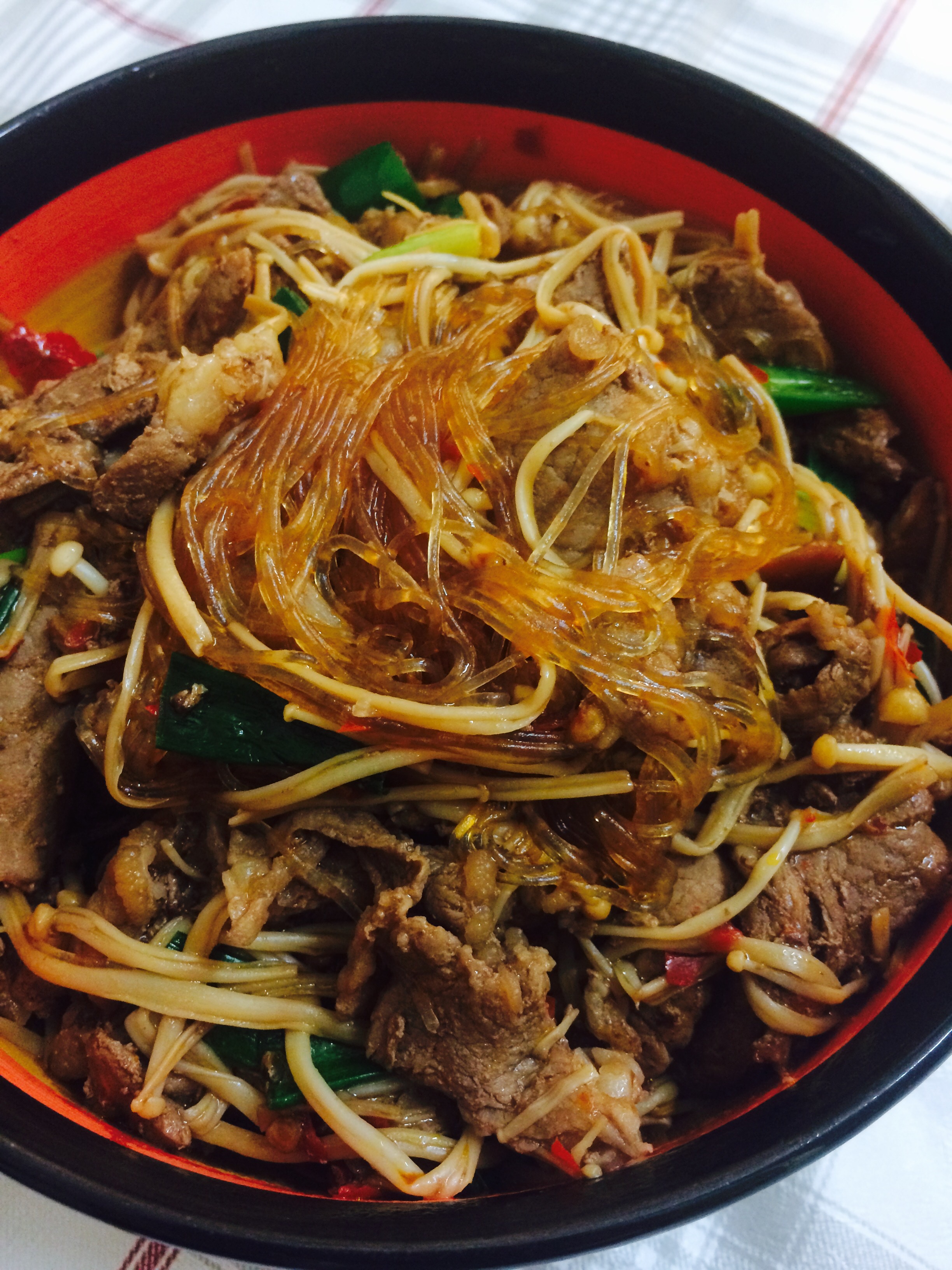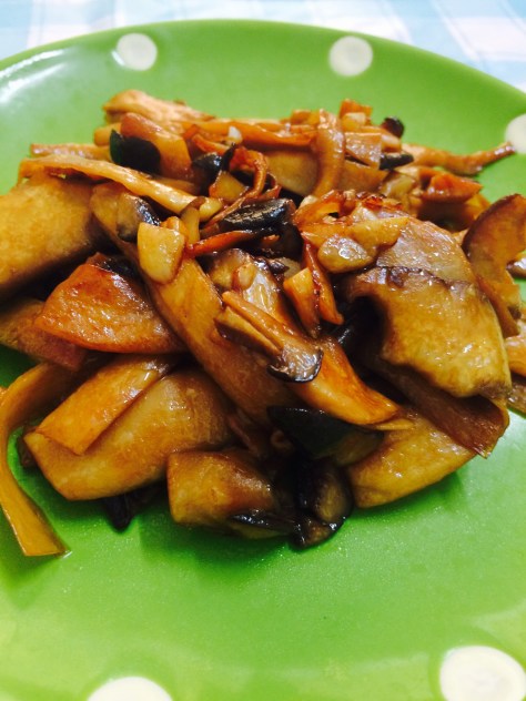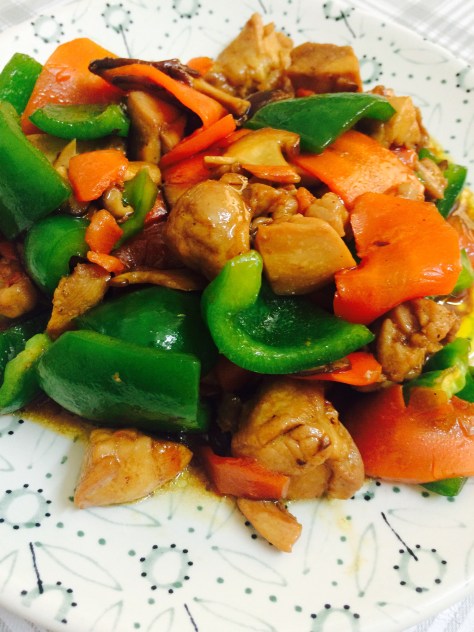 It’s a dish made mainly of chicken, shiitake and green bell pepper.