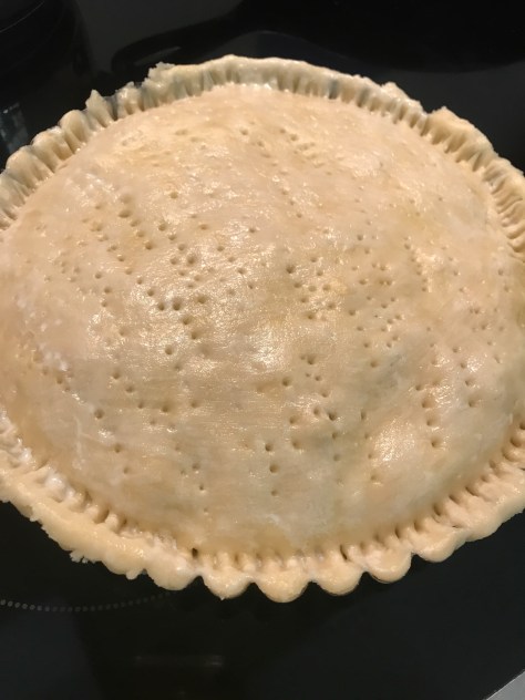 Cover with another piece of pie crust. Also poke with fork. Brush milk or egg.