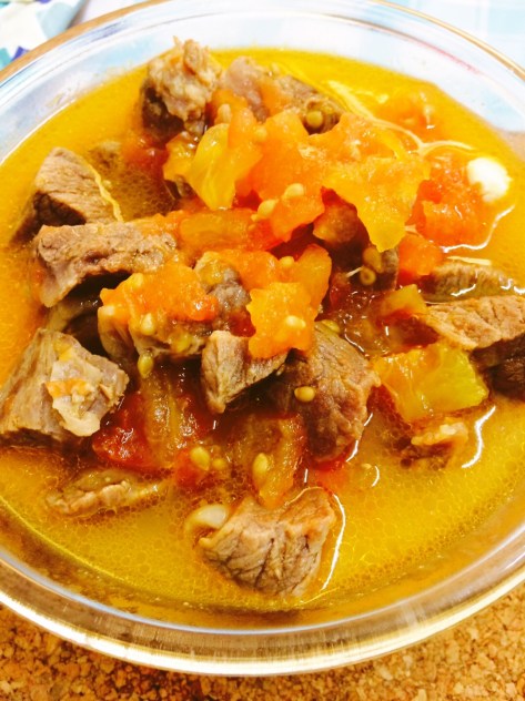 1. Beef pieces in boiling water till water gets boiled again. Take beef out, rinse and drain.