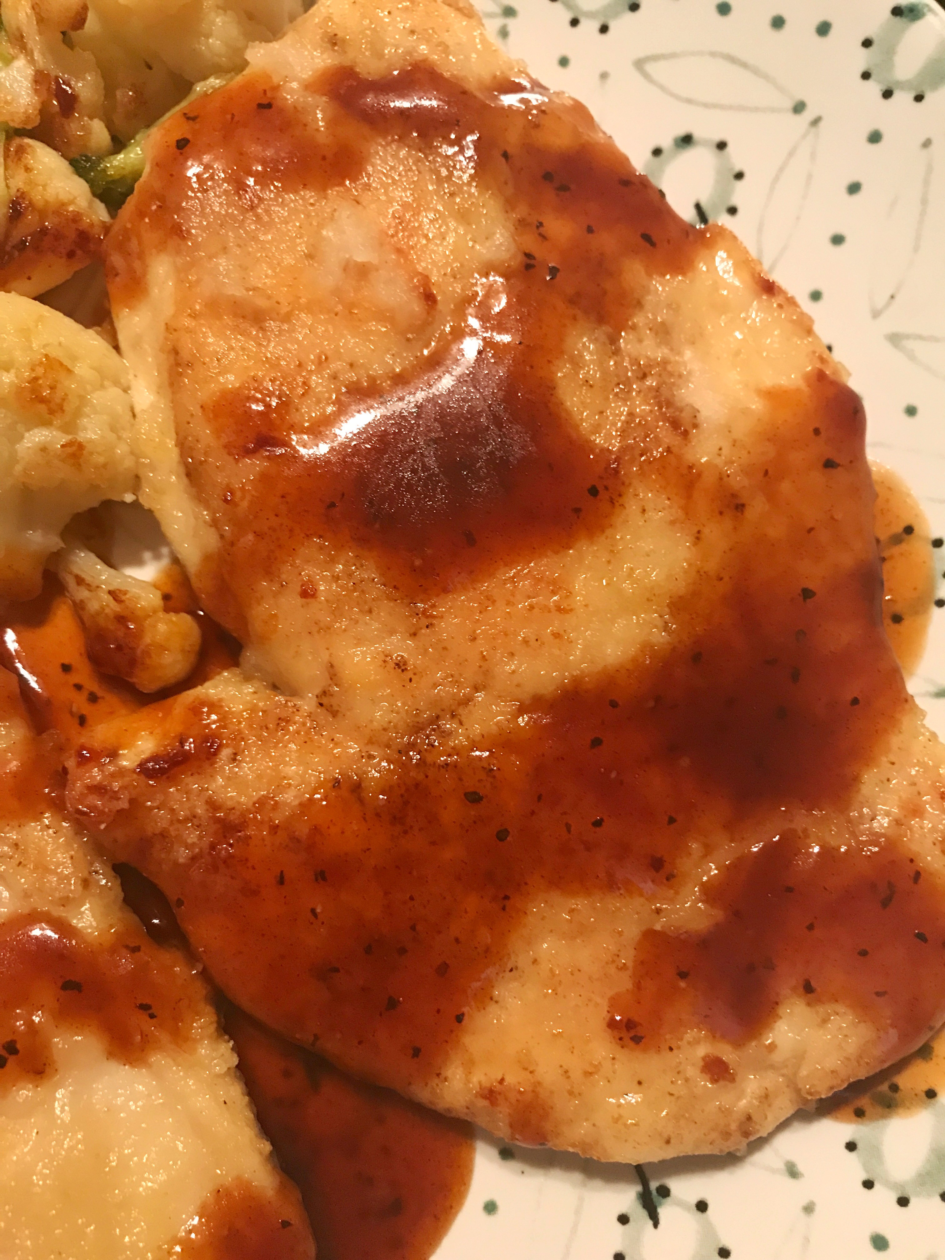 6. For the sauce, you can use the one you like. I put 2 tsp HP sauce, 1 tsp light soy sauce, 1 tsp sugar, 2 tsp water and 1/2 black pepper granule. Mix them in saucepan on the stove till condensed. Pour over chicken breast.