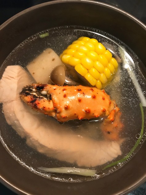 For the claws, I used them to cook light soup. Put crab claws, corn pieces, Chinese yam, mushroom, ginger shreds and spring onion pieces into a pot. Pour in 1 1/2 bowls of water. Turn to high heat. When water boils, put in salmon slices. Turn to middle heat and cook for 3 mins. Add in 1 tsp sweet cooking wine and salt. Cook for another minute.