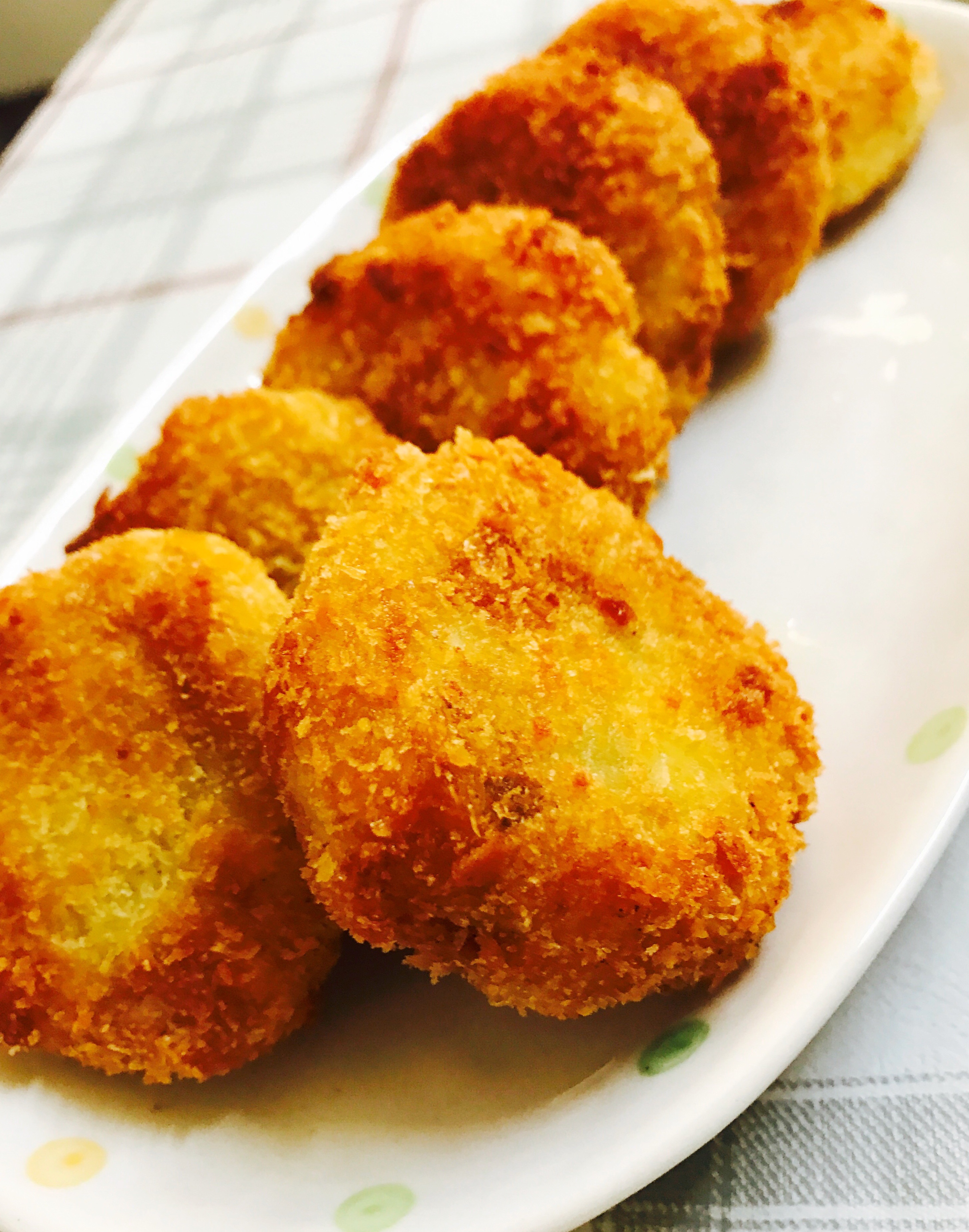 - Coat eggplant croquettes in bread crumbs. And fry till golden brown.