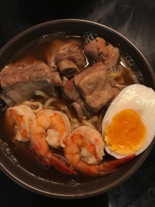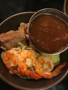 - Separate prawn sell, head and meat. Heat a pan, add in 1 tsp oil. Stir fry 3 chopped cloves of garlic and 1 chopped shallot. Add in prawn head and shell. Stir fry till red. Pour in 1 L water and add in pork ribs. Also add in 2 tsp white pepper, 1 tbsp light soy sauce, 1 tbsp fish sauce and 10g rock sugar. I used pressure cooker to cook them for 20mins. Drain the soup, then the broth is ready.