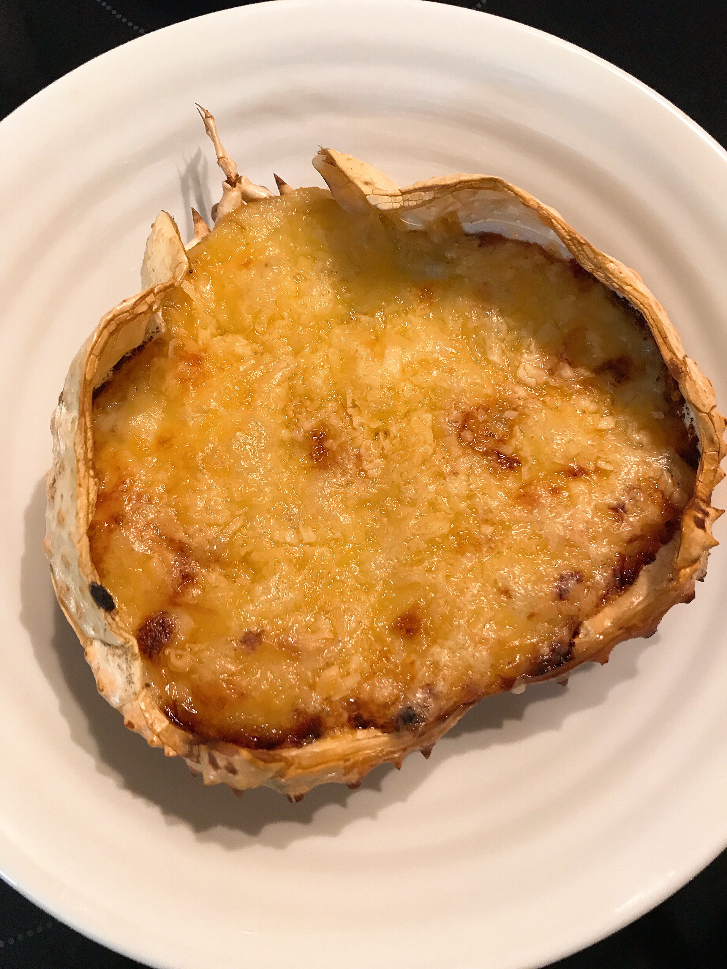 For the central body, I took the Shell off. Then picked the meat out. Heat a pan, melt a small piece of butter. Put the meat in. Sauté a bit. Add in 1 tablespoon flour. Quickly stir. Then add in 3-4 tablespoon milk. Stir slowly and evenly to let it reduce to white sauce. Put the crab meat white sauce into the shell. Sprinkle cheese. Put into oven ( 200 degree C, 8-10 mins) or till cheese melts.