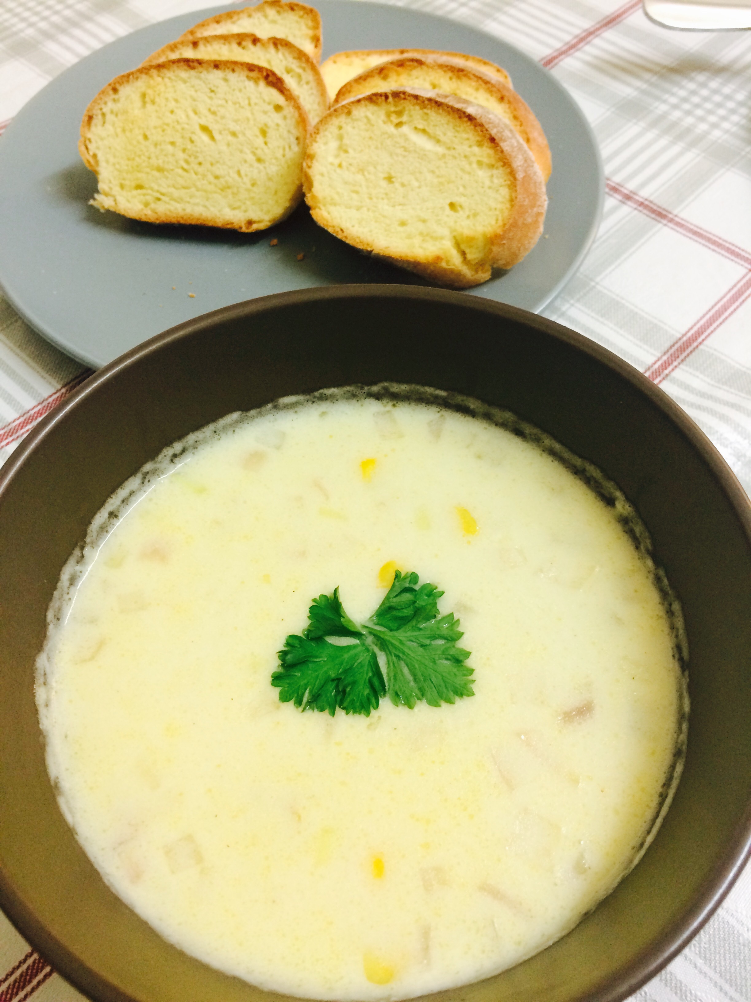 2. Add in onion and corn kernels. Stir fry a bit. Pour in water covers all ingredients. Simmer for around 10 mins. (I also add in several shrimps.)