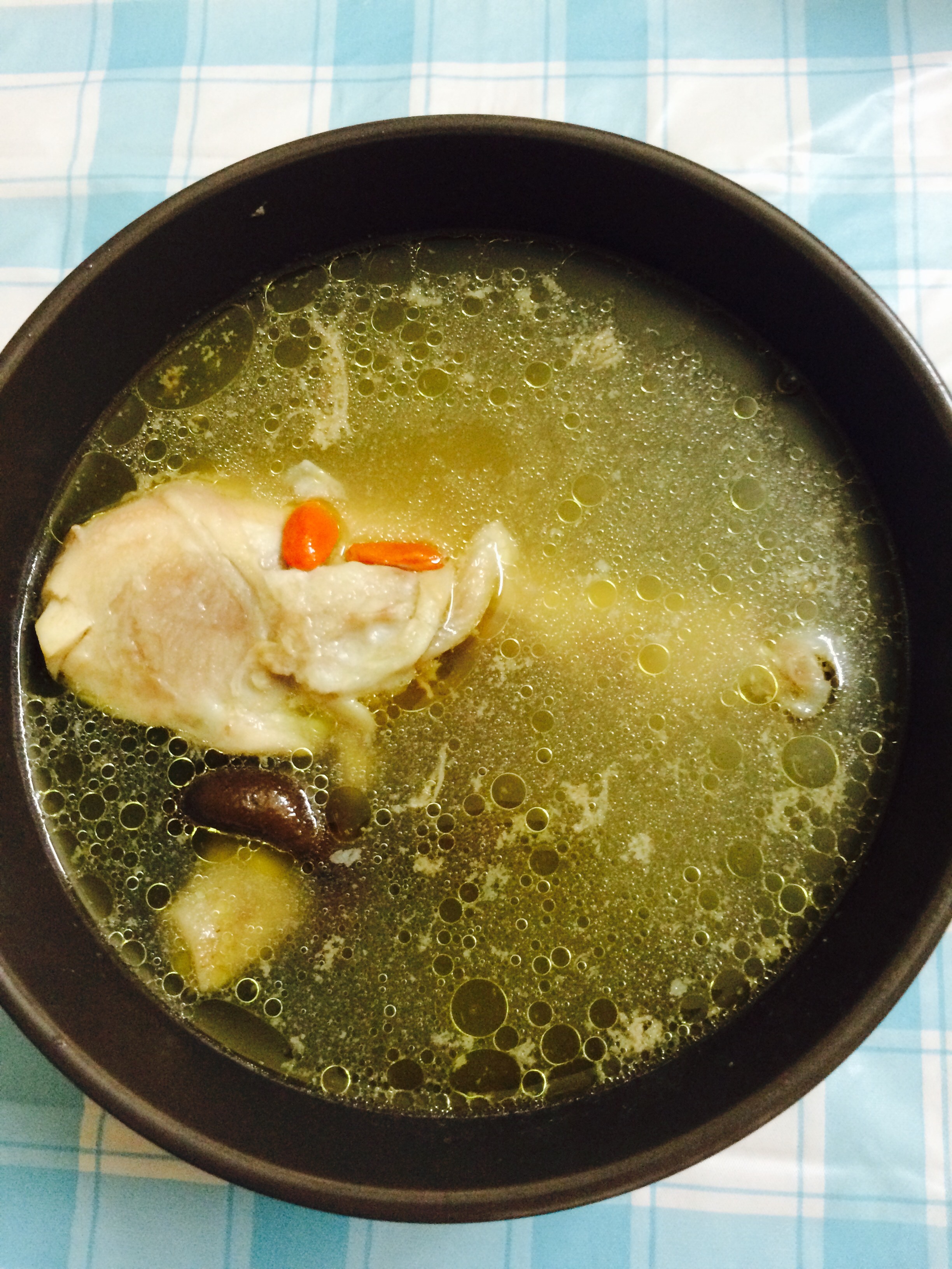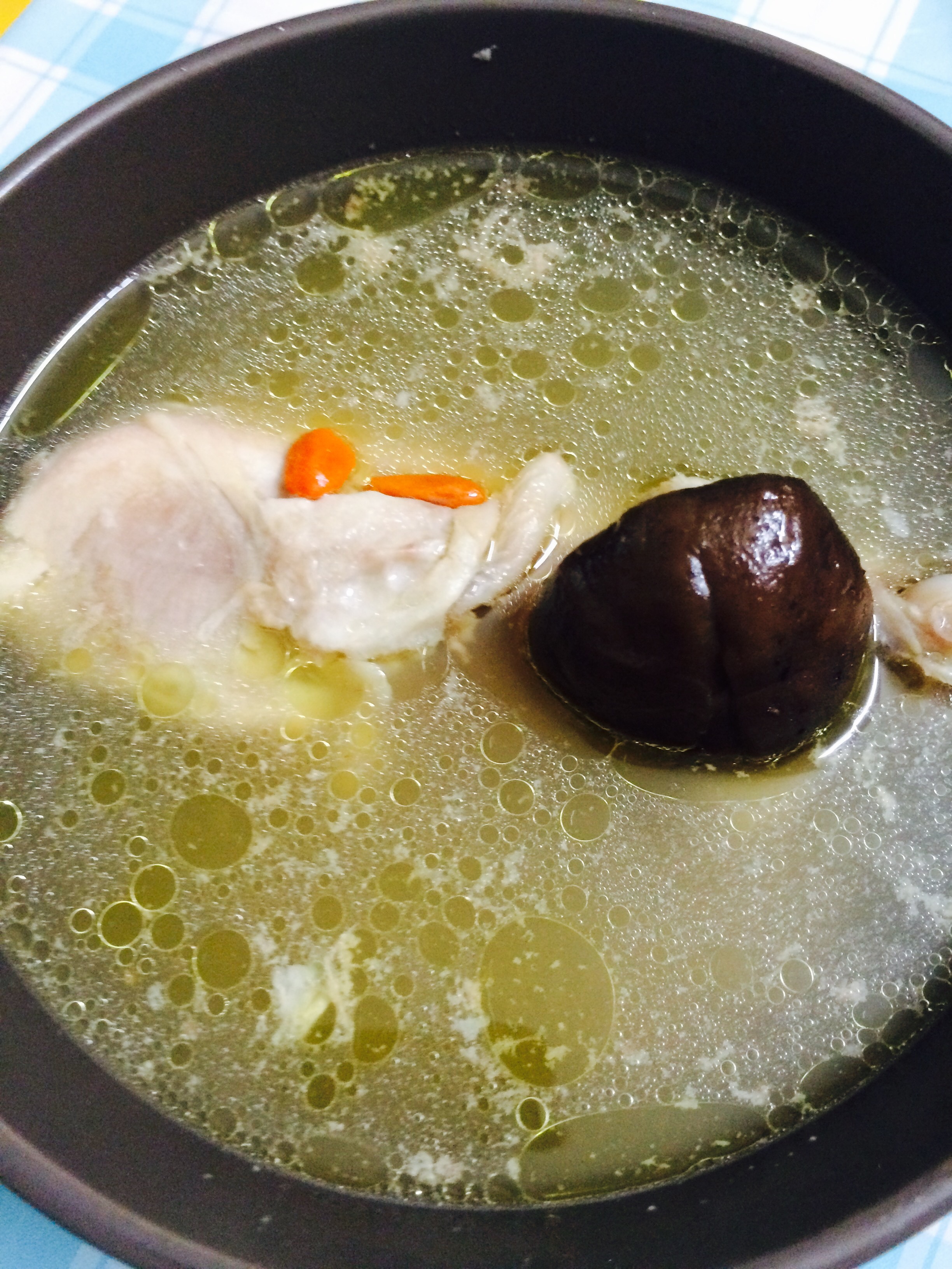 This soup is very easy. Just put chicken leg in a pot, add in enough water. At first, use medium heat. After water gets boiled, turn to low heat. Cook for half an hour. Then add in shiitake and wolf berries. Cook for at least another half an hour. Add in salt and it’s done.