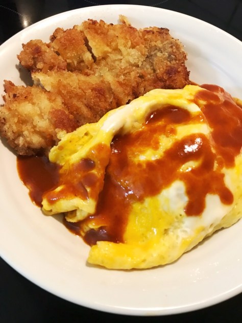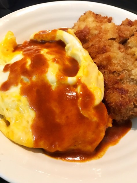Put fried pork chop and rice in a plate. Top rice with a fried egg. Then pour curry sauce over it.